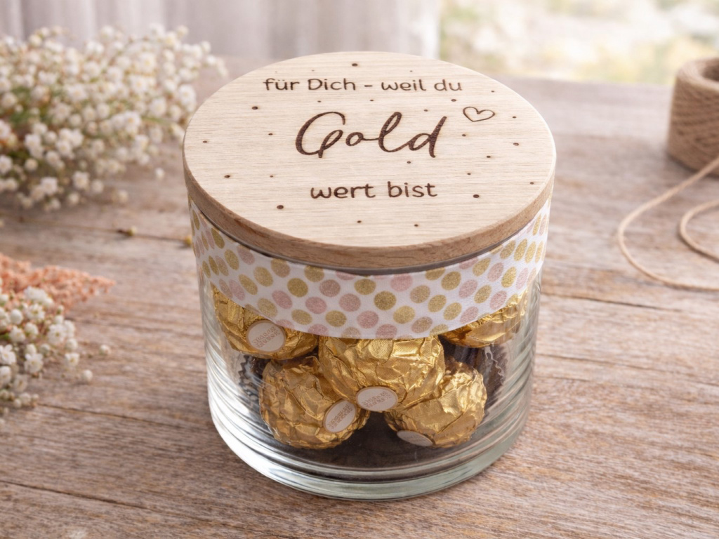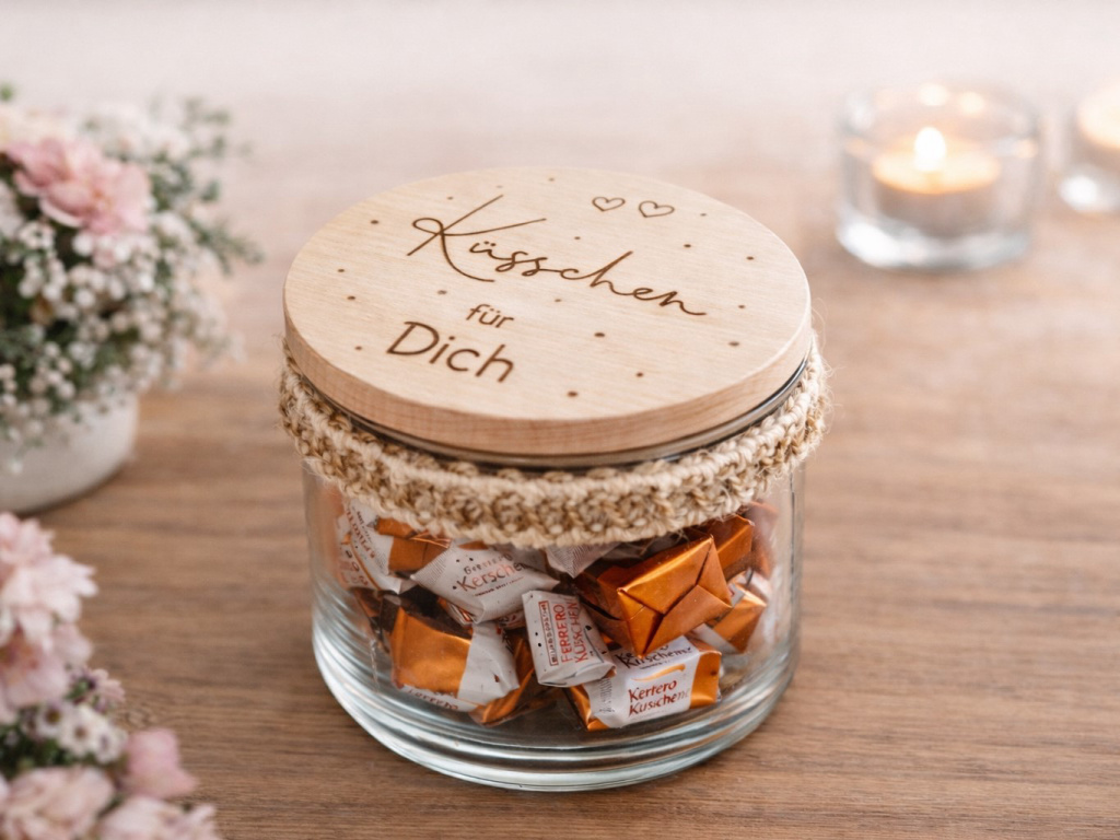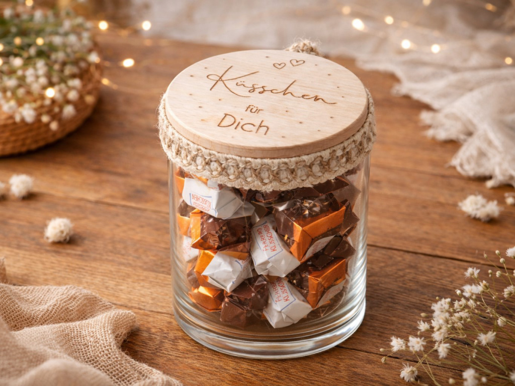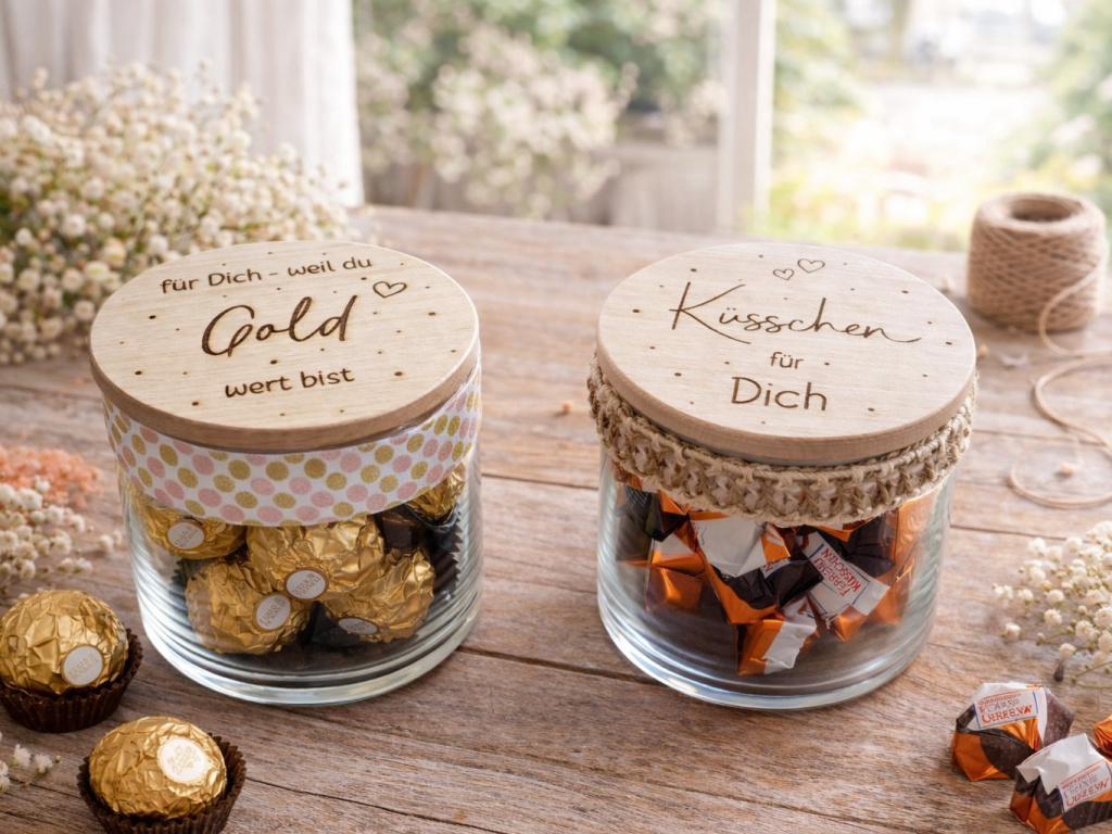 Liebevoll gestaltete Geschenkgläser mit graviertem Holzdeckel – gefüllt mit süßen Naschereien und einer persönlichen Botschaft.