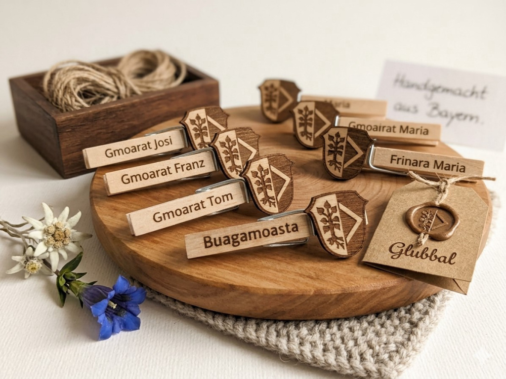 Gubbal, bayerisch für gravierte Wäscheklammern, sind immer ein Hingucker. Individuall gestaltbar für - Hochzeiten - Geburtstage - Vereine - Firmen - Dirndl u. Lederhose oder einfach so als Geschenk